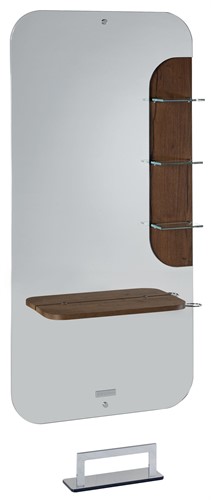 Stilren arbetsplats från Salon Ambience. Spegel med 3st små hyllor i glas och mörkt trä som bakgrund. Hylla i mörkt trä, LED-belysning bak. Fotstöd ingår.