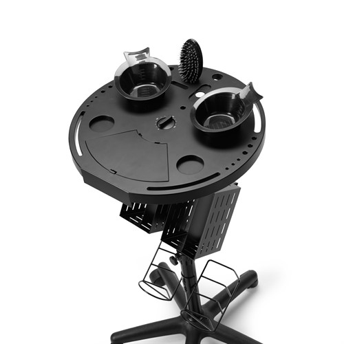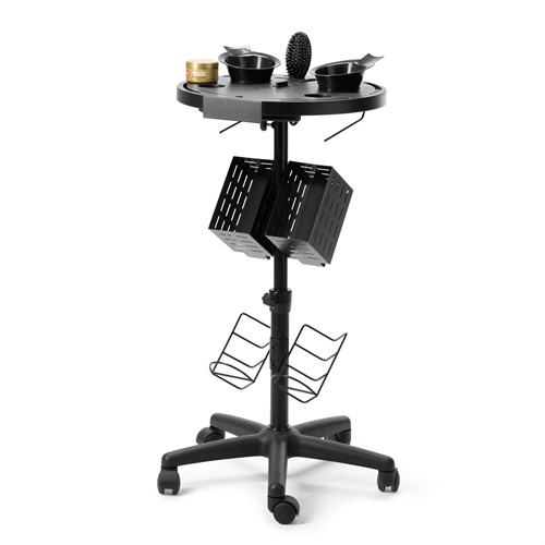 Praktisk färgvagn på hjul med plats för 2 färgskålar och 2 flaskor väte. 2 boxar att förvara färgtuber och annat i. Höjd 90cm