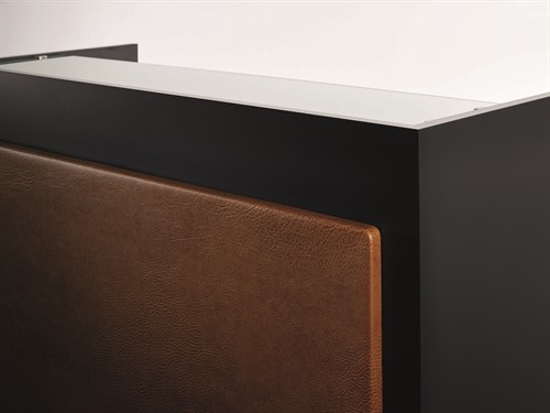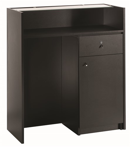 Kassadisk med glas uppe på. En låda och ett skåp för förvaring.