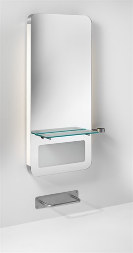 Snygg arbetsplats med glashylla och LED-belysning på sidorna.