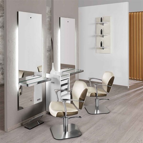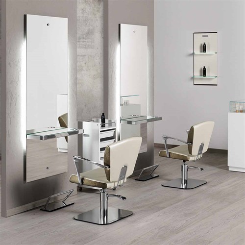 Den imponerande formen på Maya stylingstol skapar ett starkt intryck i varje salong, tack vare både stolens tjocka, stilfulla design och de vackert formade armstöden i aluminium som fulländar stolens starka visuella uttryck, samtidigt som den erbjuder maximal komfort. Dessutom kan klädseln anpassas genom att välja mellan ett brett utbud av färger utan extra kostnad!