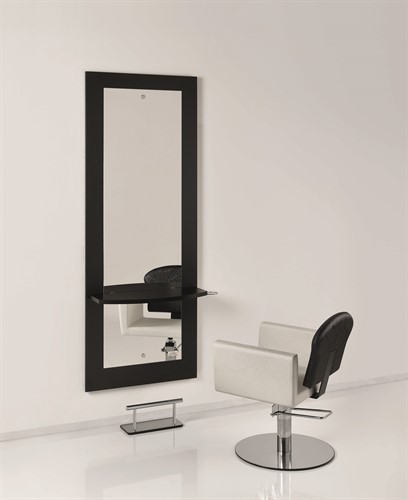 Ge din salong en modern touch med Melodia styling-spegeln av Luca Rossini. Geometrisk design, svart melaminram och LED-alternativ. Inkluderar säkerhetsfilm, arbetsyta med hårfönshållare och fotstöd.