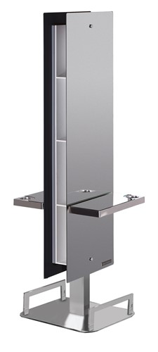 Stilren arbetsplats dubbel från Salon Ambience. Spegel med hylla i rostfritt med spegelglas över, LED-belysning bak. Integrerade fotstöd i golvstativet.