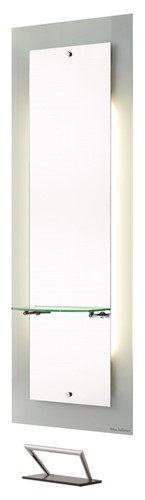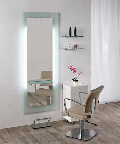 Stilren arbetsplats från Salon Ambience. Spegel med hylla i glas, fönhållare och LED-belysning bak. Fotstöd ingår.
