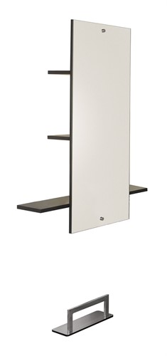 Snygg stilren arbetsplats från Salon Ambience. Spegel med 3st hyllor och LED-belysning bak. Fotstöd ingår. Går att välja mellan 3 olika materiel.
