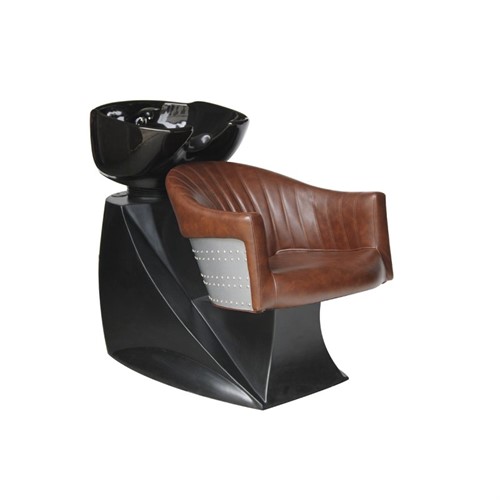 Bekväm schamponering i modern retrostil. Stommen är tillverkad av stabilt, svart fiberglas, som är enkelt att hålla rent. Det keramiska handfatet kan tiltas. Stolen är tillverkad med konstläder i hög kvalitet och med en stoppning som ger bästa komfort. Ryggstödet är dekorerat med aluminium och drar blickarna till sig salongen. Hår kan enkelt städas bort tack vare öppningen längst bak. Levereras med blandare. HBD: 94 x 64 x 123 cm.