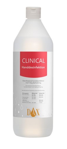 DAX Clinical handdesinfektion är en hygienisk handdesinfektion som innehåller 75 vol% denaturerad etanol. Desinfektionen innehåller två olika återfuktare och är kliniskt testad att klara dagligt vårdarbete, tack vare återfukningen kan denna handdesinfektion användas dagligen. DAX Clinical handdesinfektion är även mycket effektiv mot bakterier, jästsvamp och olika typer av virus, så som influensavirus, HIV och Murine Norovirus. Stor flaska på 1-liter som räcker längre.