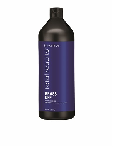 Total Results Brass Off Color Obsessed är en komplett produktserie som neutraliserar varma toner i blekt hår samtidigt som den ger näring, mjukhet och skydd åt håret. Brass Off schampo neutraliserar varma gula toner för att rena och återställa glans i blont hår. Håret blir klart och vackert glänsande med en känsla av återfuktning. Använd schampot var annan dag för att neutralisera oönskade varma toner.
