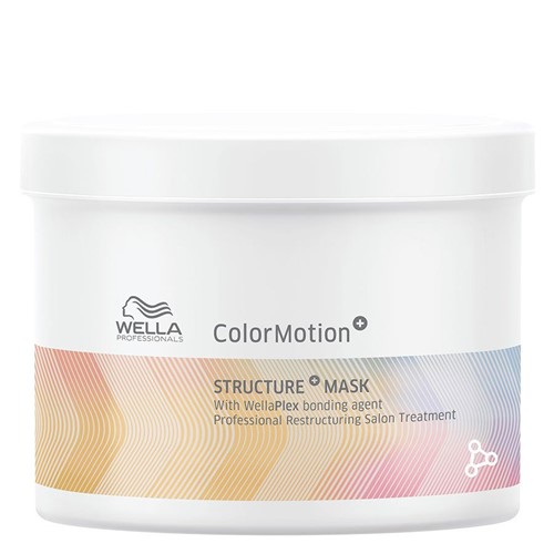 ColorMotion+ Structure+ Mask är en behandling för färgbehandlat hår som bygger upp hårstråna inifrån samt skyddar färgbehandlat hår i upp till åtta veckor. Behandlingen är berikad med WellaPlex som stärker bindningarna i håret samtidigt som håret får glans och en varaktig följsamhet.