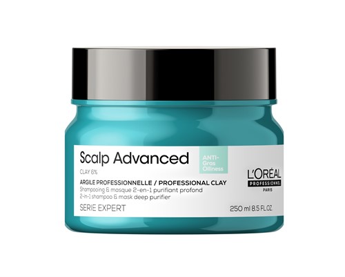 L'Oréal Scalp Advanced 2-in-1 djuprengörande mask/lera är framtagen för fet hårbotten. Avlägsnar produktrester, svett och fett när den används som schampo och rengör produktrester, svett och fett när den används som inpackning. Håret känns lättare och får mer volym.