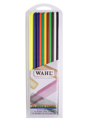 Wahl Clipper Combs är långa klippmaskinskammar. Mått: 20,5 cm. Kommer i 12-pack med blandade färger.