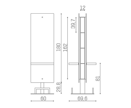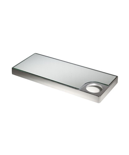 Stilren arbetsplats dubbel från Salon Ambience. Spegel med hylla i rostfritt med spegelglas över, LED-belysning bak. Integrerade fotstöd i golvstativet.