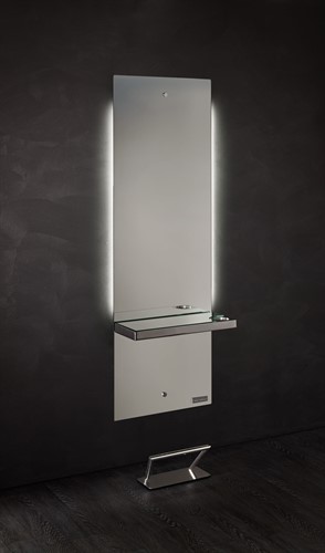 Stilren arbetsplats från Salon Ambience. Spegel med hylla i rostfritt med glasskiva över, LED-belysning bak. Fotstöd ingår.
