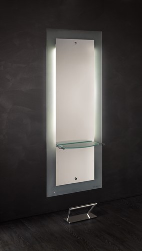 Stilren arbetsplats från Salon Ambience. Spegel med hylla i glas, fönhållare och LED-belysning bak. Fotstöd ingår.