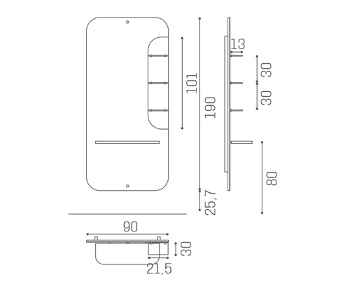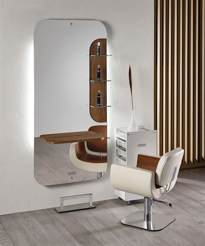 Stilren arbetsplats från Salon Ambience. Spegel med 3st små hyllor i glas och mörkt trä som bakgrund. Hylla i mörkt trä, LED-belysning bak. Fotstöd ingår.