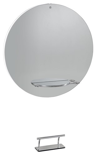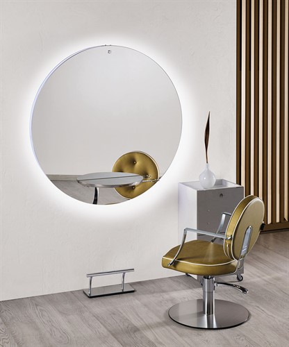 Snygg arbetsplats från Salon Ambience. Spegel med hylla i rostfritt, LED-belysning bak med ställbar kontroll för olika färger av lyset. Fotstöd ingår.