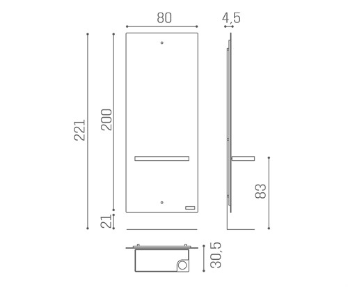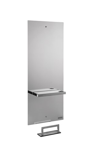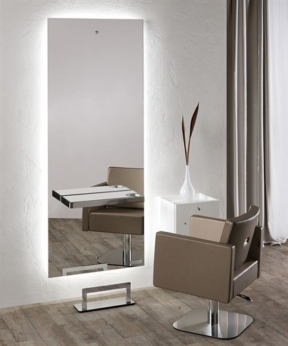 Stilren arbetsplats från Salon Ambience. Spegel med hylla i rostfritt med glasskiva över, LED-belysning bak. Fotstöd ingår.