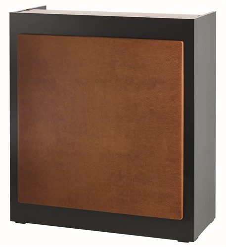 Kassadisk med glas uppe på. En låda och ett skåp för förvaring.
