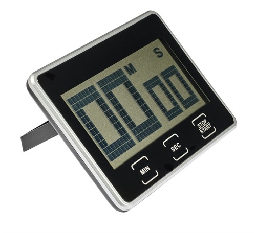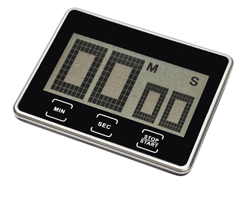 Digital timer med nedräkning och räkna upp funktion. Stor och lättläst LCD-display. Mätområde: 99 minuter och 59 sekunder. Stark ljudsingnal. Batterier ingår 2xAAA. Mått 9x7x2cm.