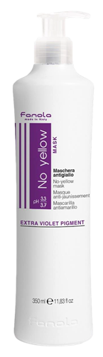 Fanola No Yellow Mask passar till blekt, blont, slingat eller grått hår. Dess formula har speciella violetta pigment som neutraliserar oönskade gula reflektioner. Gör håret mjukt, glansigt och silkeslent. Extra violetta toner.