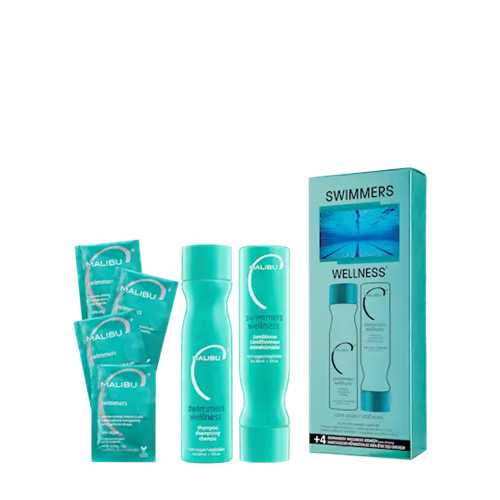 Trassligt, tovigt, missfärgat simmarhår? Detta exklusiva kit har allt du behöver för att ta bort klor, koppar och andra poolämnen samtidigt som det skonsamt rengör och vårdar. Upptäck ett glansigare, friskare och tovfritt hår! Sulfatfri schampo och näringsrik balsam arbetar med de veckovisa behandlingarna för att hålla ditt hår mjukt, glansigt och friskt!