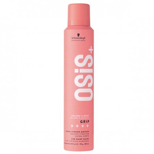 Osis Grip är en kraftfull mousse som ger extra hård stadga med volym och naturlig glans. Den håller bångstyrigt hår på plats samtidigt som den ger värmeskydd upp till 230°C. Moussen har en vegansk formula.
