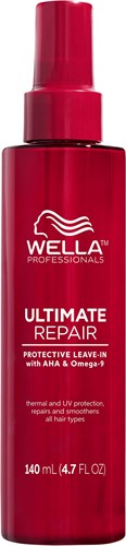 Ultimate Repair Protective Leave-In från Wella Professionals är en delikat och lyxig hårkräm som fungerar som ett serum. Den skyddar omedelbart skadat hår från fem viktiga faktorer: avbrutna hårstrån, UV-strålning, värme, mekaniska skador och överdriven frissighet. Denna 5-i-1-styler reparerar synligt blekt och värmeskadat hår och minskar frissighet i upp till 72 timmar*, vilket gör håret mjukt, silkeslent och 8x slätare**. Lämpligt för alla hårtyper.